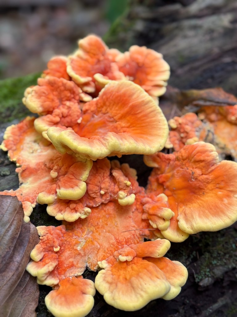 Beyond its striking appearance and potential as a wild edible (not an expert on this), Chicken of the Woods plays a critical role in the ecosystem. It helps decompose dead or decaying trees, recycling nutrients back into the soil and contributing to the forest’s health. Sometimes, it also acts as a weak parasite, infecting living trees and causing heart rot, which can eventually lead to the tree’s decline. In this way, the mushroom supports both life and death in the forest.